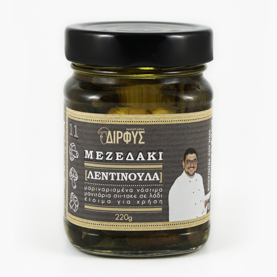 Μανιτάρια shiitake (Λεντινούλα) γνωστά για την πικάντικη γεύση τους μαρινάρονται σε αρωματικά βότανα (λουίζα,θυμάρι,δαφόφυλλα), εσπεριδοειδή και μηλόξιδο.